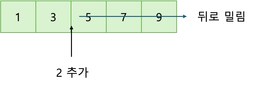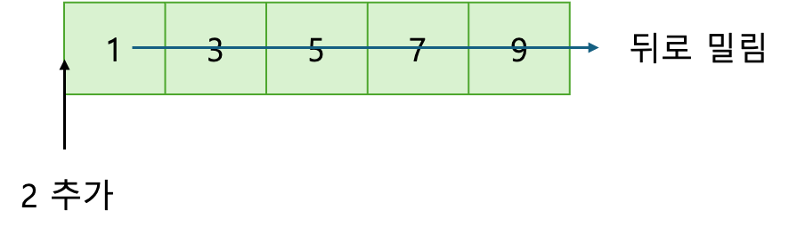 그렇다면 중간에 삽입할 경우는 어떨까? 위의 그림처럼 5앞에 2를 추가하게 되면 5이후의 데이터는 모두 뒤로 밀리게 된다. 즉, 현재 삽입한 데이터 뒤에 있는 데이터 개수만큼 미는 연산을 해야 한다. 밀어야 하는 데이터 개수가 N개라면, 이것 또한 시간복잡도는 O(N)이 된다.