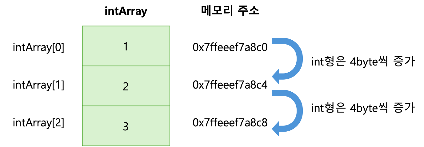 배열로 선언한 변수들은 메모리의 연속된 공간에 할당된다. 따라서 다음의 그림을 보면 배열의 원소 간 주소값은 변수 크기만큼 차이난다. 예를 들어, 정수형(int)이면 4byte씩 차이가 난다. 실수형(double)의 경우는 8byte씩 차이가 난다.